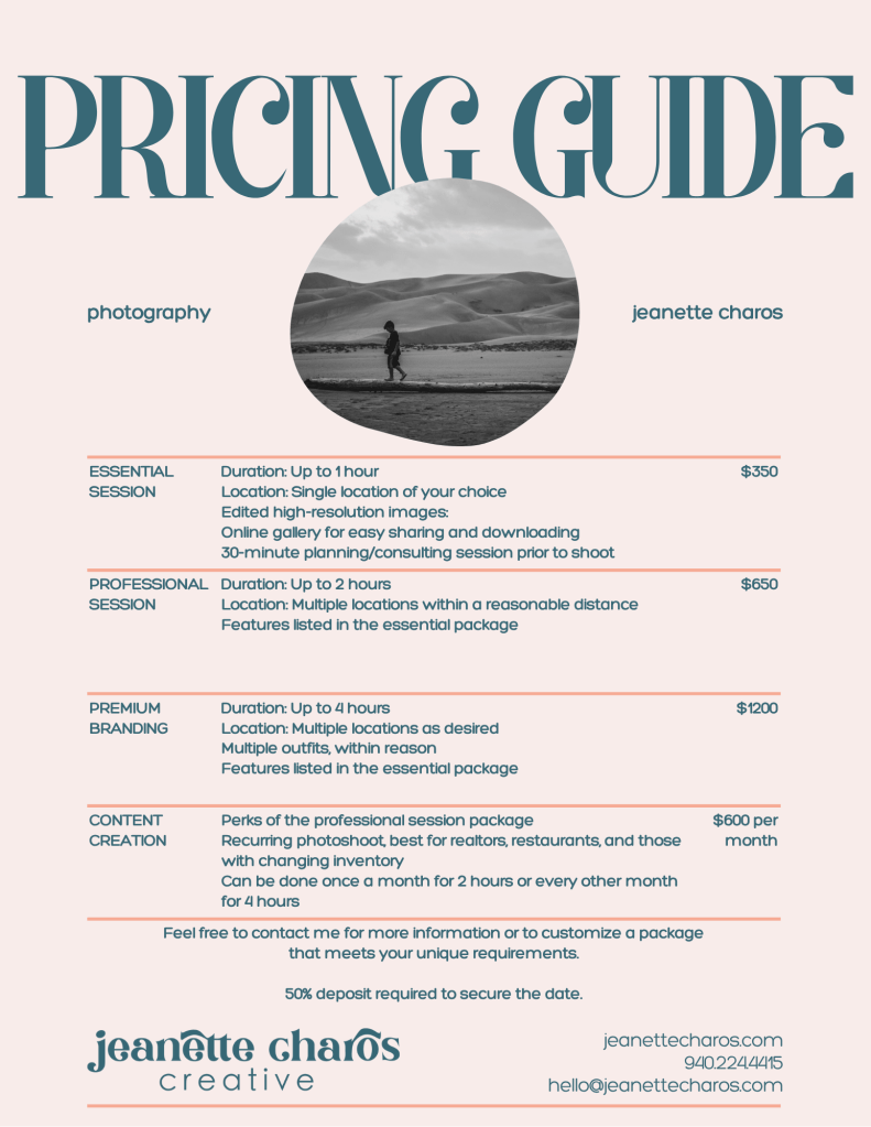 Thank you for your interest in working with Jeanette Charos Creative! Please review my packages below. I am open to creating custom packages based on your needs, just let me know in the form below.